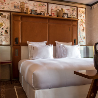 Now magnificently restored, the architecture resonates with Philippe Starck’s vision of the 1920s and 1930s. Each space, each detail, each material, each object conveys a modern nostalgia, the contrasting soul of Spain: the telluric strength of the lobby, paved entirely in terracotta, counterbalances the weightlessness of the celestial whites in La Capsule, while the restaurant’s rustic, woven-leather ceilings counter the sophistication of an art gallery window…